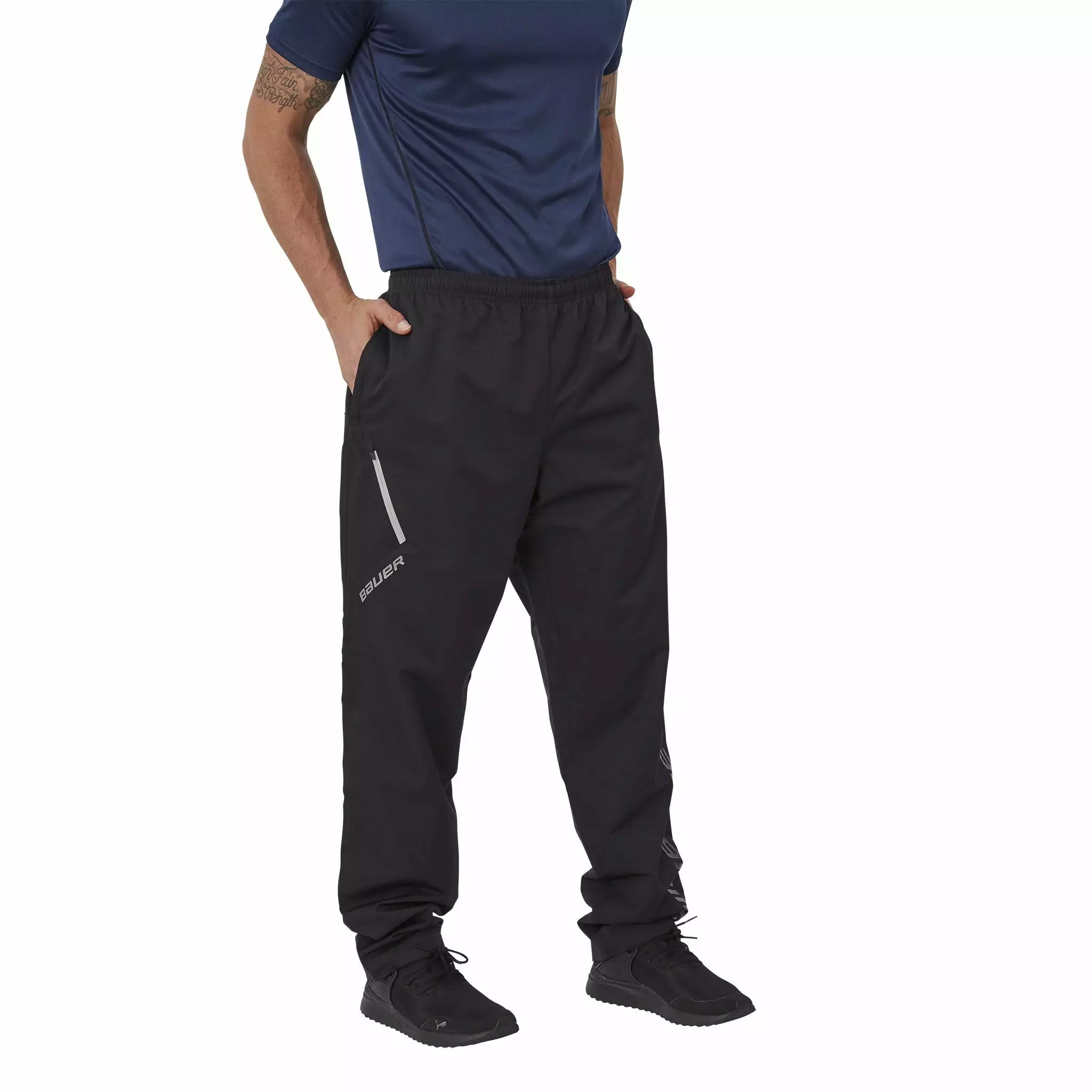 - BAUER screenprinted logo on left lower leg and right thigh
