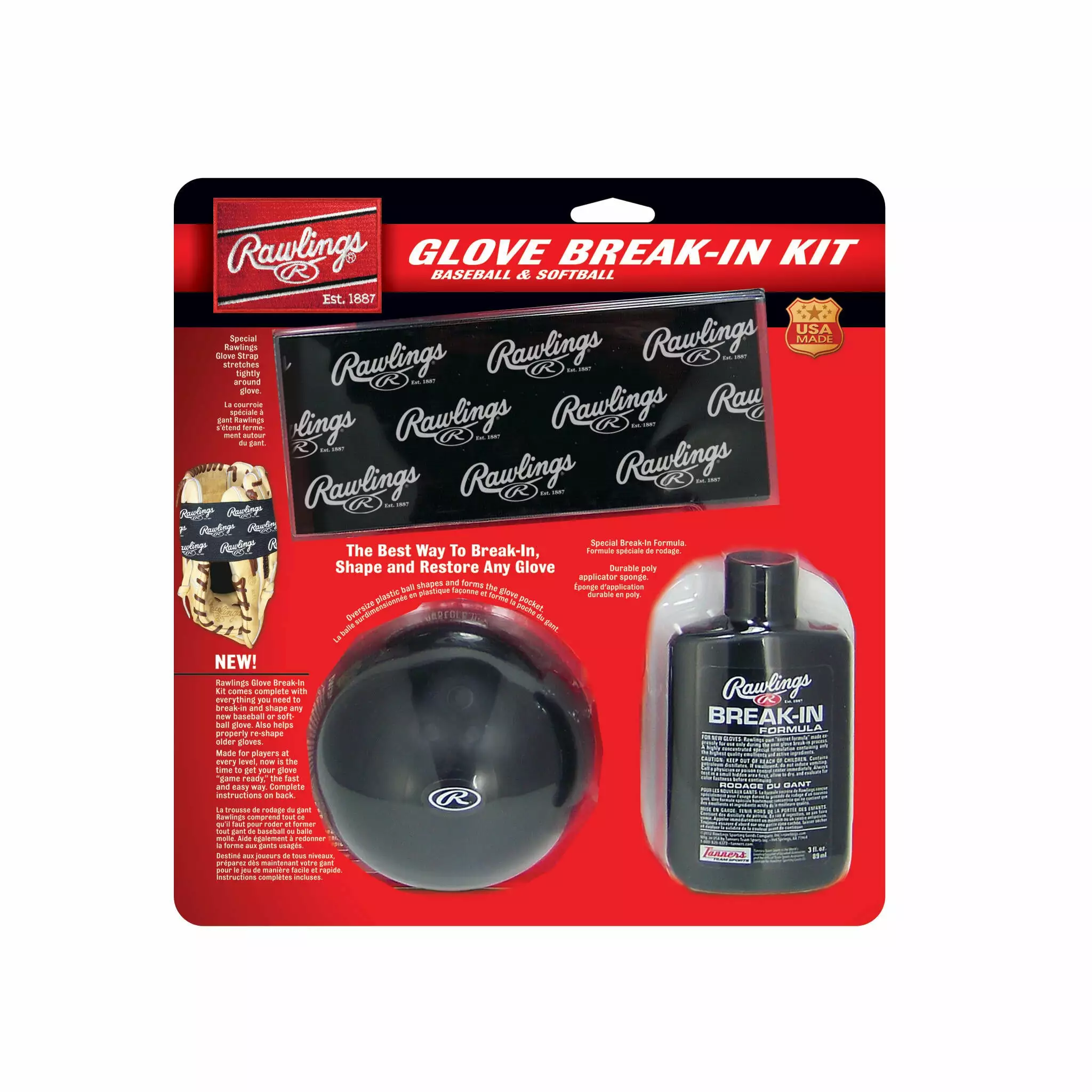 Break-in, shape and restore any baseball or softball glove just like the pros. This kit is developed for players at all levels and is the fastest and easiest way to get a new ball glove broken-in and “game ready.” This kit features a special strap, oversized ball, Glovolium Break-in Formula, hydra applicator sponge, and complete instructions.