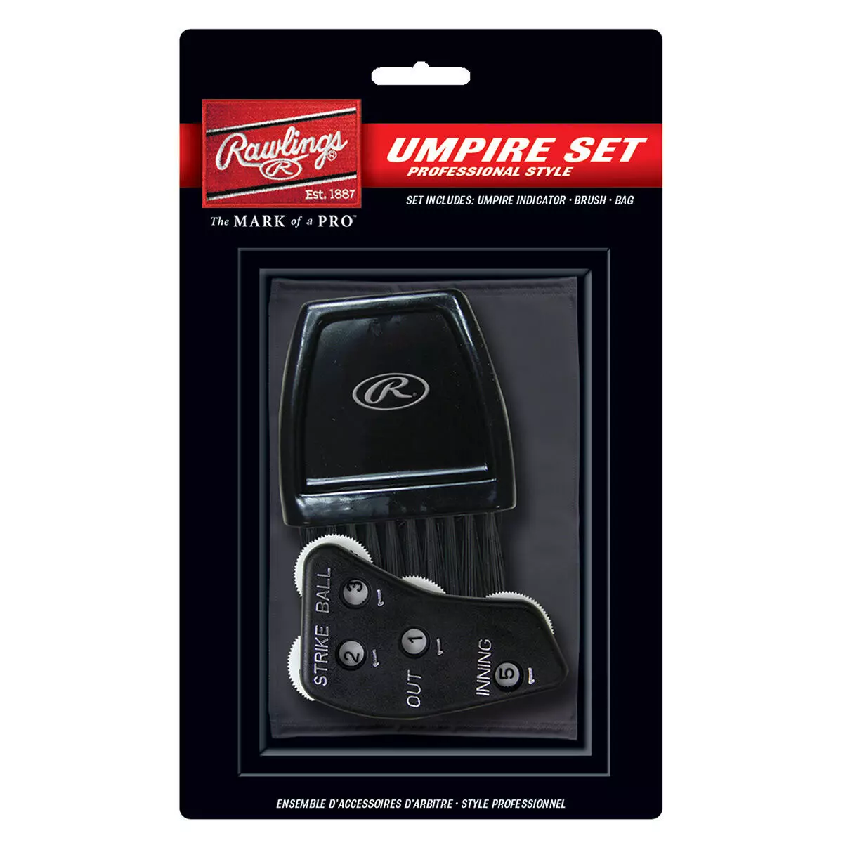 This umpire set includes a black umpire bag, an umpire brush, and a 4-dial umpire indicator presented for retail in a blister card. This is a great kit for umpires looking for the best value on a complete set of accessories.