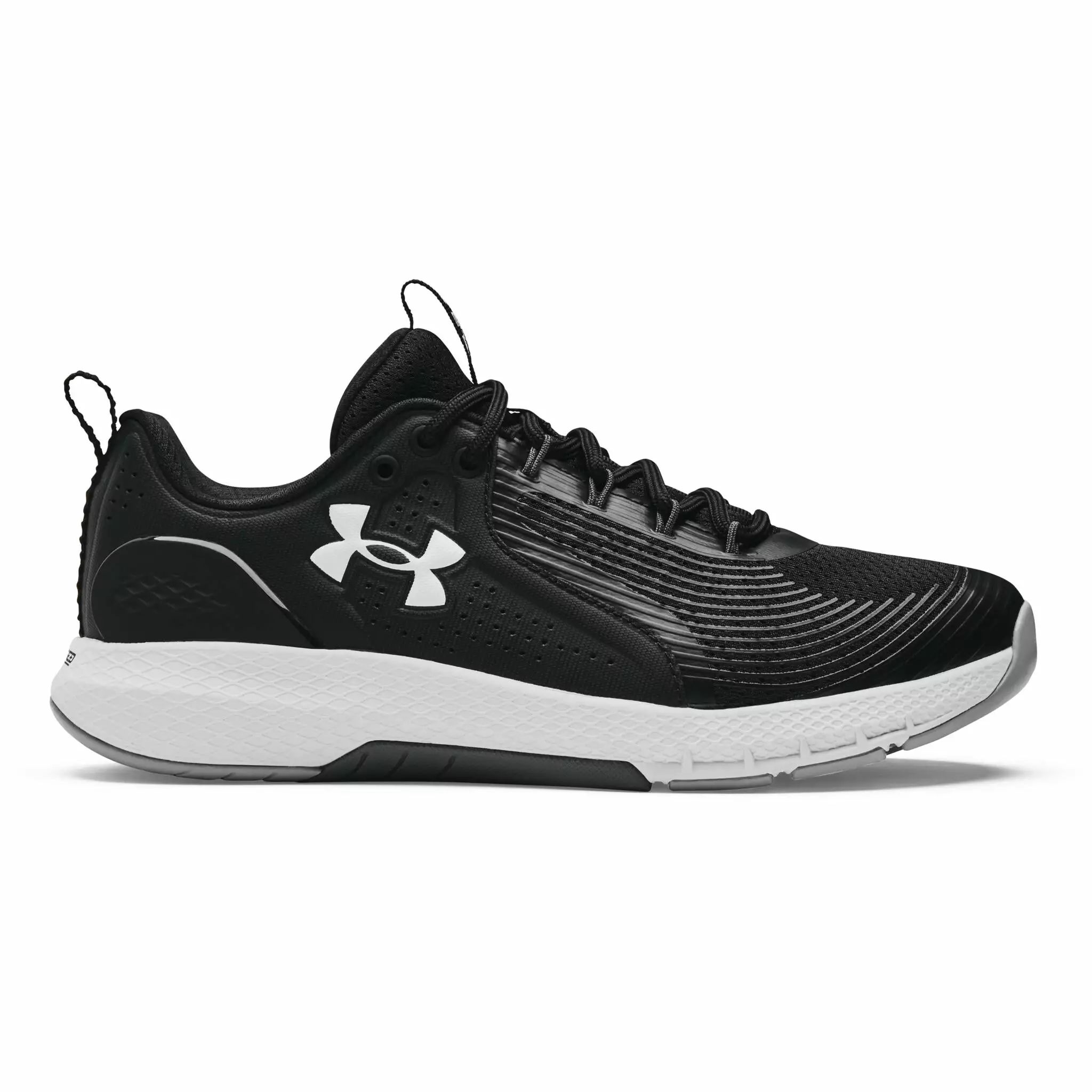 These are serious training shoes. There’s a leather on the top of your foot to keep you stable, flex grooves on the bottom so you can move, and Charged Cushioning for max impact absorption. All you need to do is work.