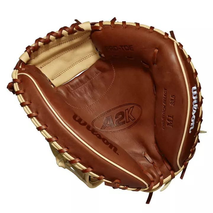Handcrafted out of the top 5% of Pro Stock hides that are chosen by a triple sorting process for consistency and flawlessness, this Wilson A2K 33.5” Baseball Catcher’s Mitt is as close to perfect as you can get. For a start, it’d be extremely hard to not just stare at this glove, let alone use it behind the dish with the incredible blonde and copper colorway it boasts. As slick as the design is, the performance of this 33.5” Wilson A2K Catcher’s Mitt will make it easily the best looking…and the best performing. We all know by now, how important the catching position is and how important every inch is whether you are trying to get a call to go your way or blocking a ball in the dirt.